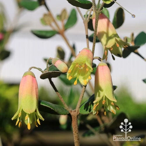DESCRIPTION: Native flowering shrub with small oval dark green leaves; small bell-shaped flowers from spring to autumn, each peach-pink with a cream-yellow rim.