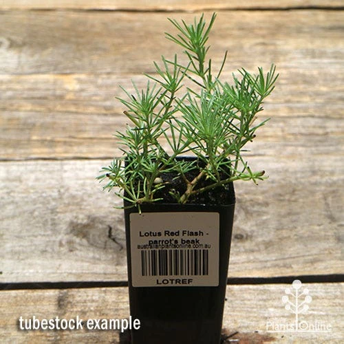DESCRIPTION: Creeping or trailing sunloving groundcover from the Canary Islands, with conifer-like soft grey-green foliage and bright beak-shaped flowers in spring and summer. L. berthelotii the species form has burnt orange flowers where Red Flash has rich red ones.